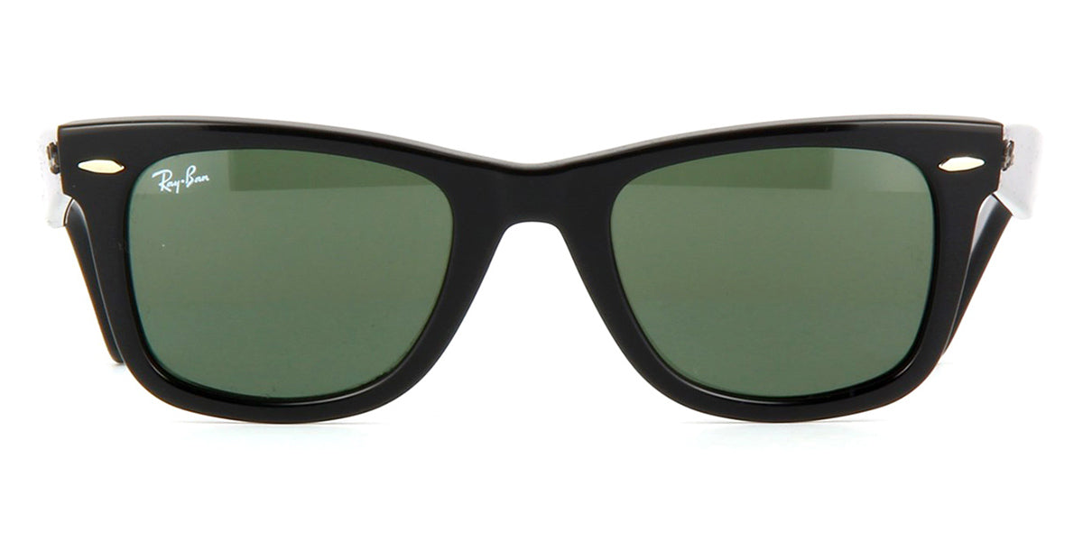 This wayfarer Ray-Ban sunglass comes in a black frame with g-15 green lenses.