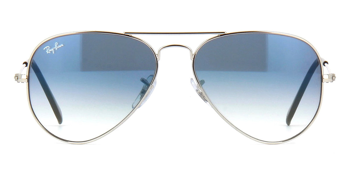 This aviator Ray-Ban sunglass comes in a silver frame with blue gradient lenses.