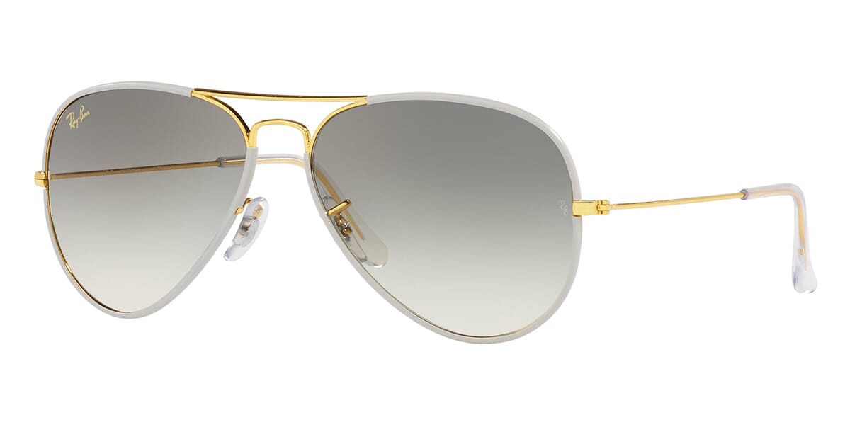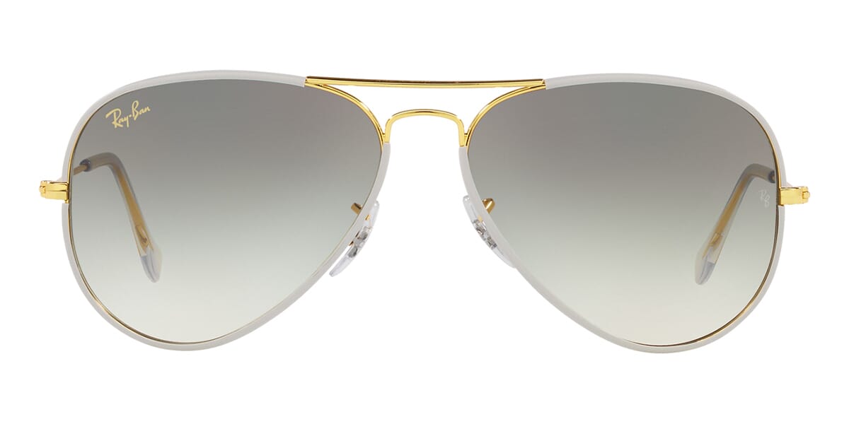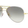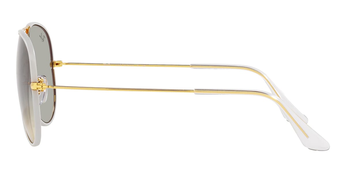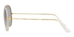 This aviator Ray-Ban sunglass comes in a grey on legend gold frame with grey to clear gradient lenses.