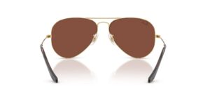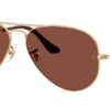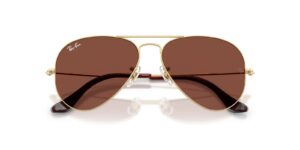 This aviator Ray-Ban sunglass comes in a arista gold frame with red lenses.