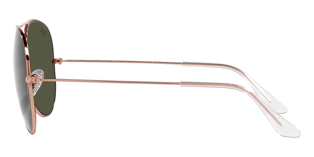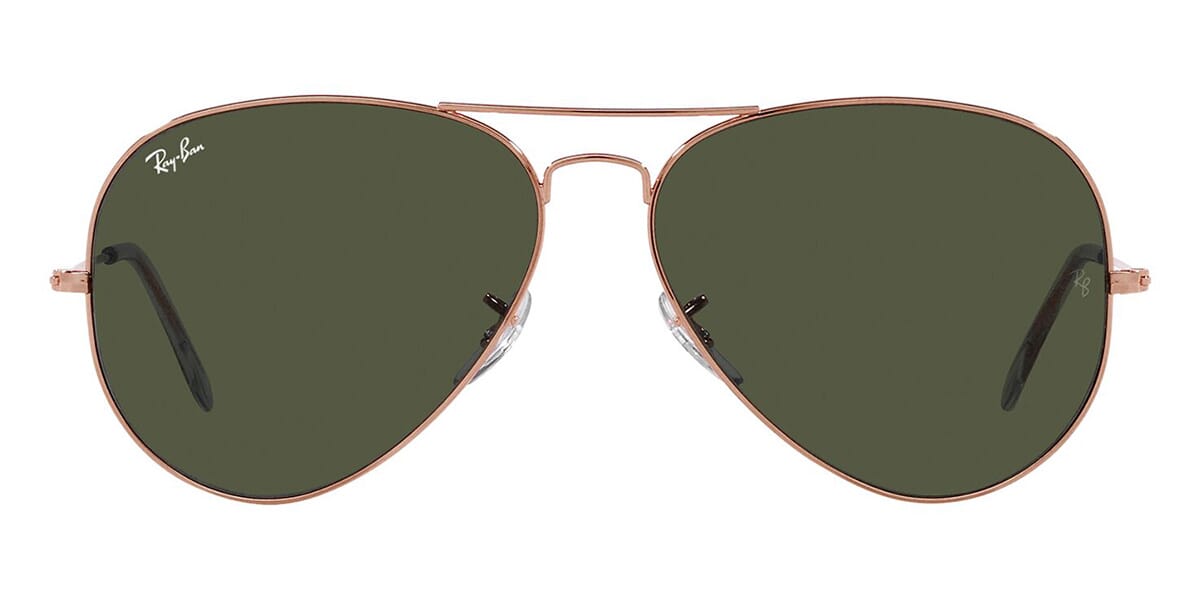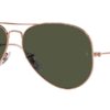 This aviator Ray-Ban sunglass comes in a rose gold frame with green lenses.