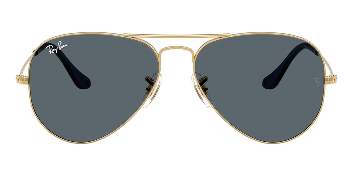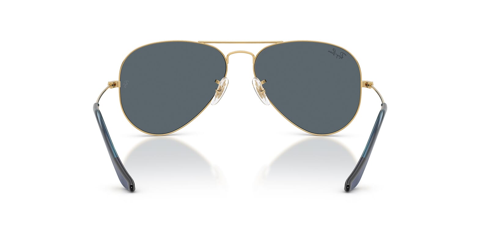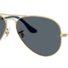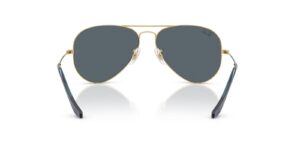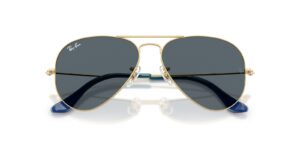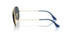 This aviator Ray-Ban sunglass comes in a arista gold frame with blue lenses.