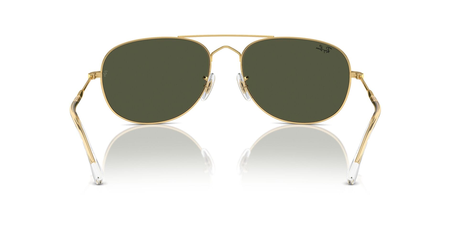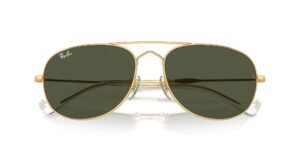 This round Ray-Ban sunglass comes in a gold frame with green lenses.