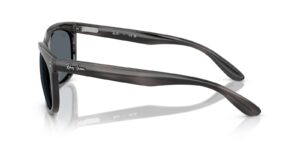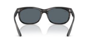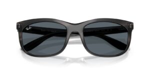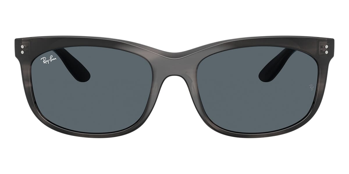 This rectangular Ray-Ban sunglass comes in a striped grey frame with blue lenses.