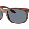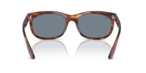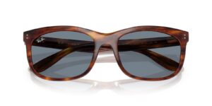 This rectangular Ray-Ban sunglass comes in a striped havana frame with blue lenses.