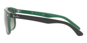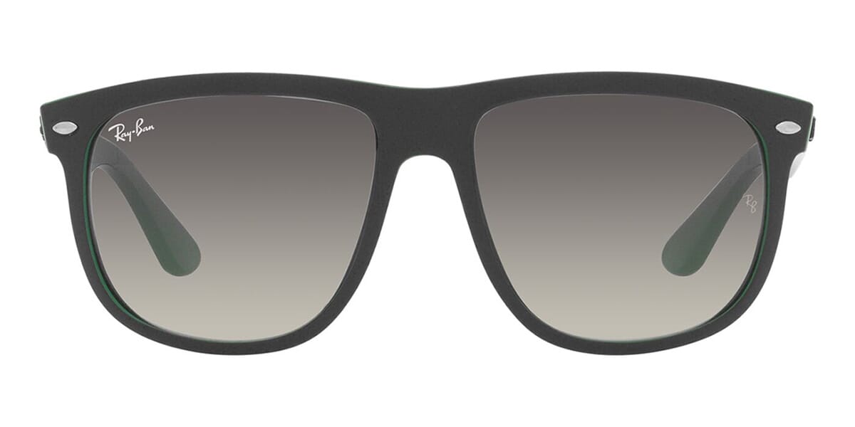 This square Ray-Ban sunglass comes in a matte black on green frame with grey gradient lenses.