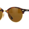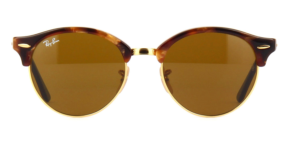 This round Ray-Ban sunglass comes in a spotted brown havana and gold frame with b15 brown lenses.
