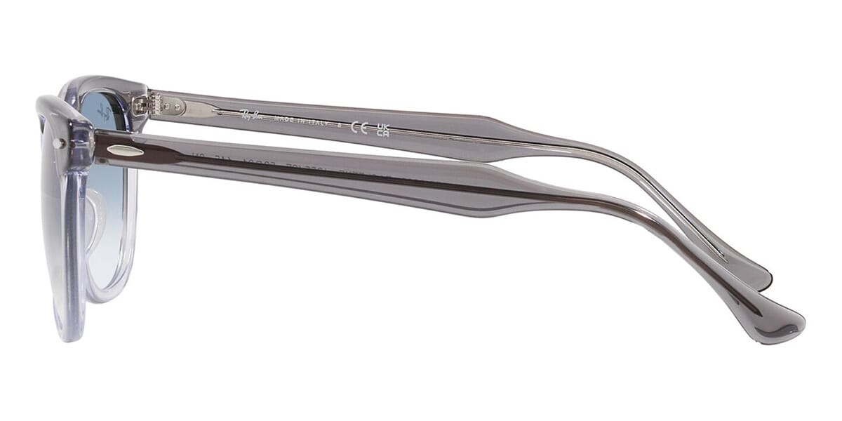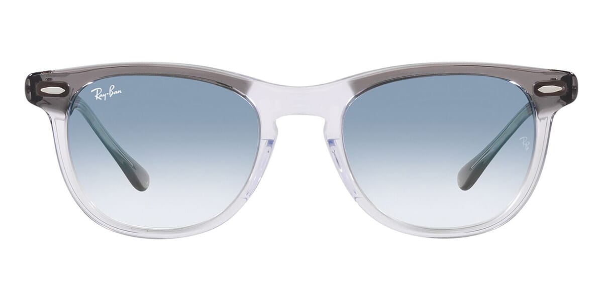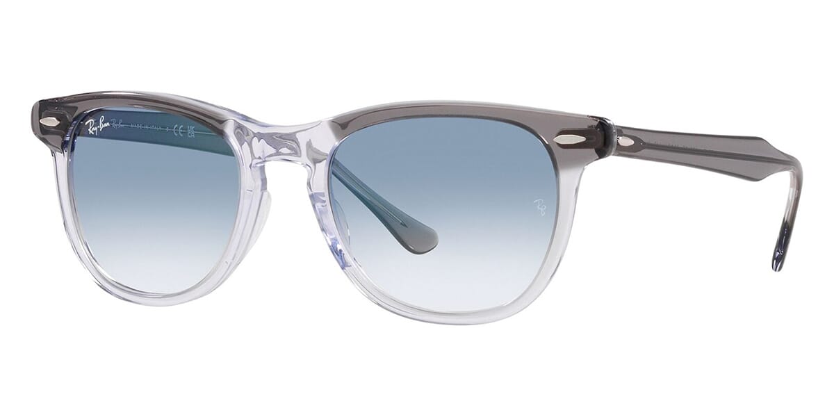 This square Ray-Ban sunglass comes in a grey on crystal frame with gradient blue lenses.