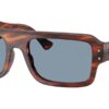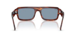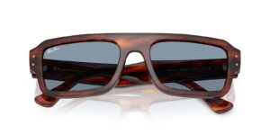 This rectangular Ray-Ban sunglass comes in a striped havana frame with blue lenses.