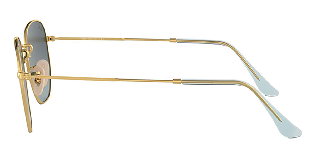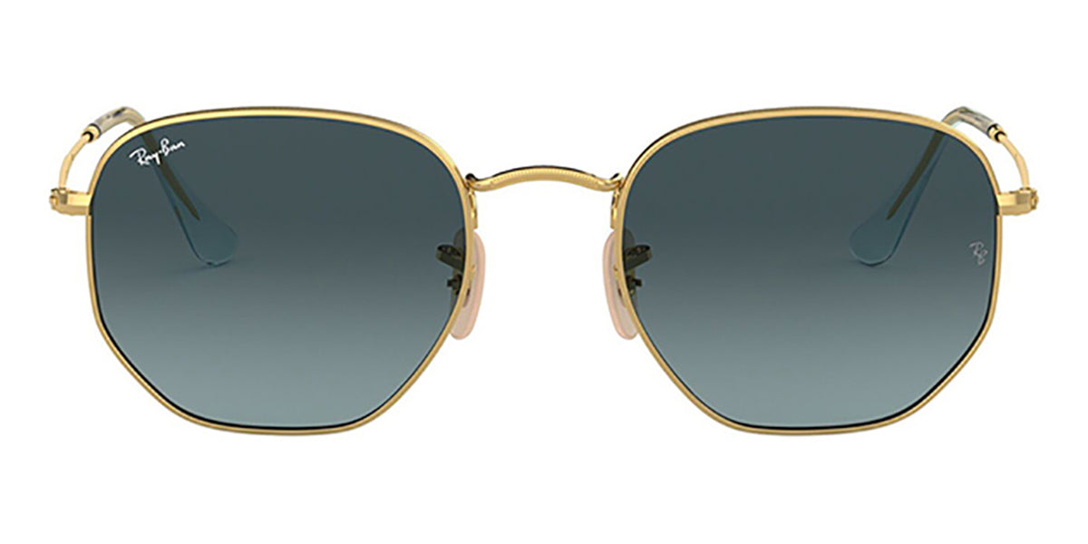 This round Ray-Ban sunglass comes in a gold frame with blue to grey gradient lenses.