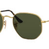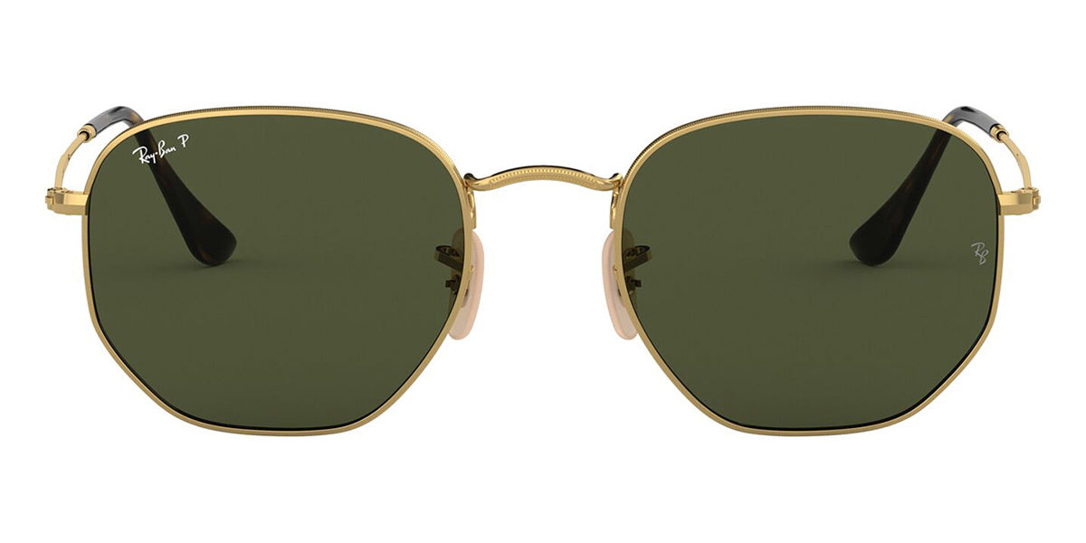 This square Ray-Ban sunglass comes in a gold frame with green polarised lenses.