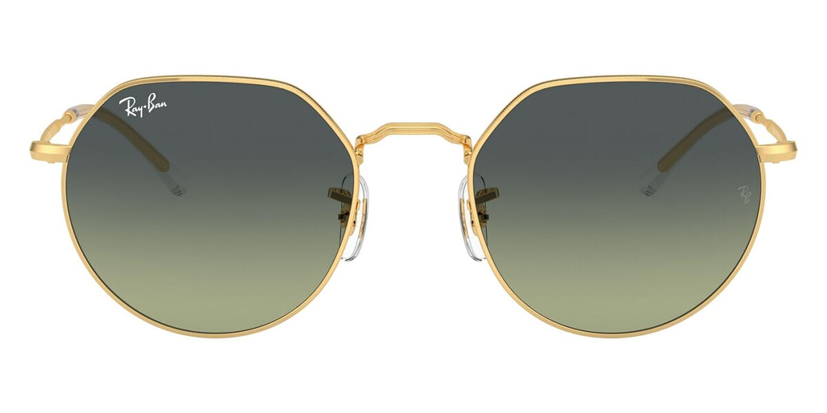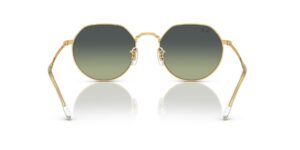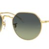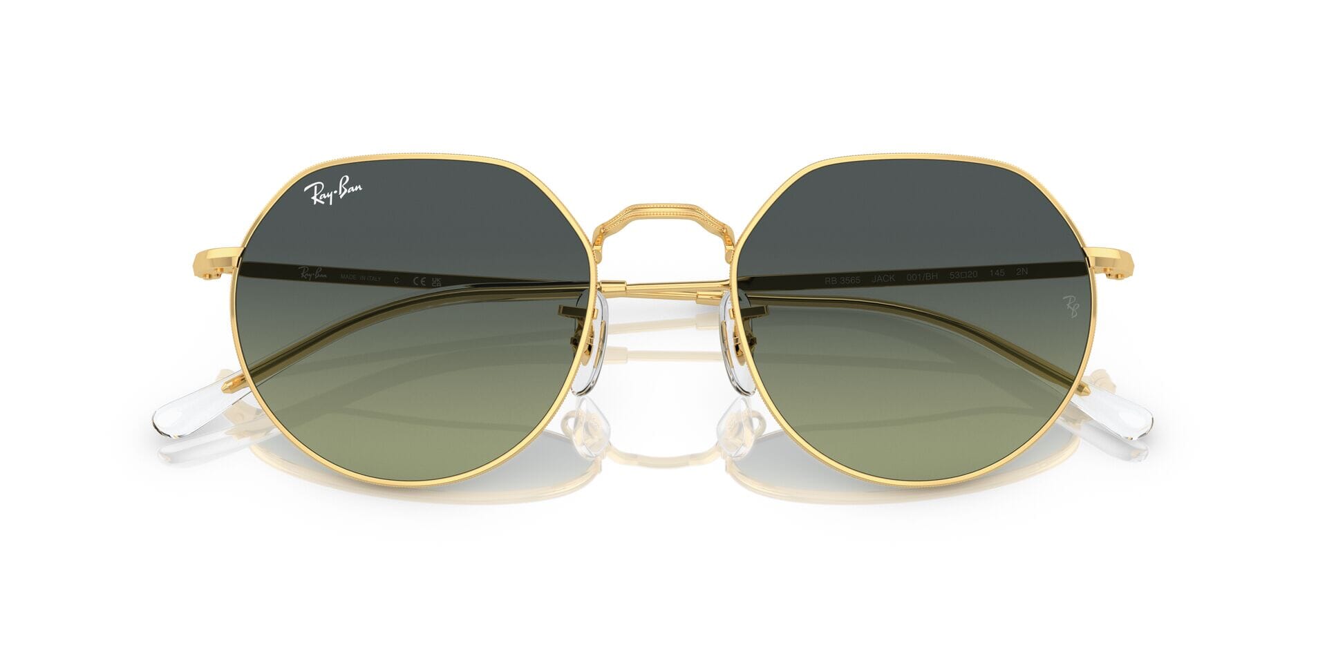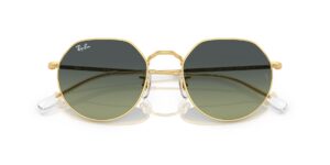 This round Ray-Ban sunglass comes in a gold frame with green vintage lenses.