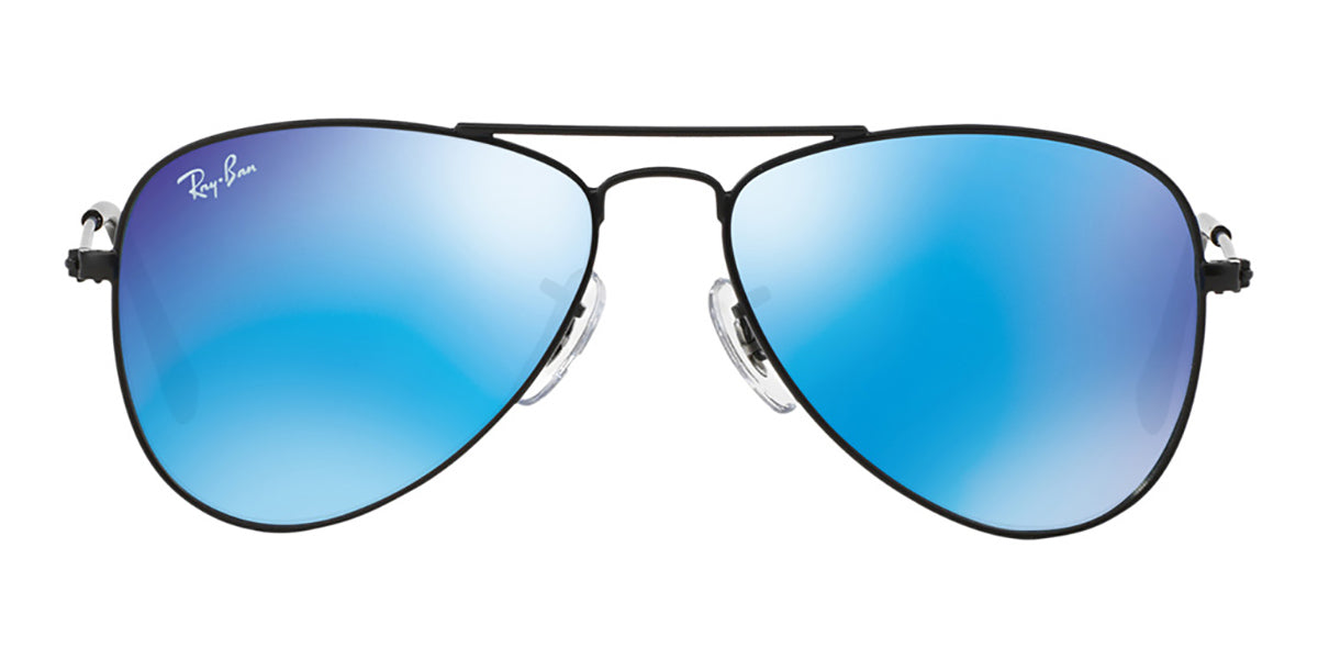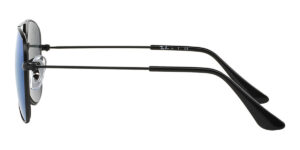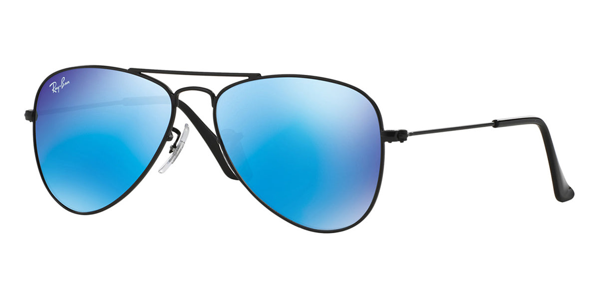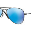 This aviator Ray-Ban sunglass comes in a matte black frame with blue mirror lenses.