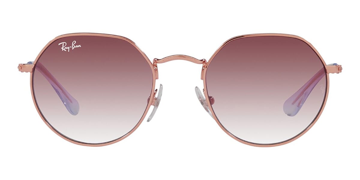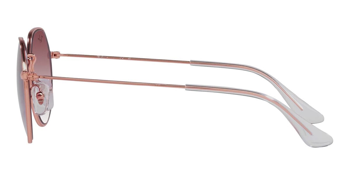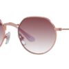 This round Ray-Ban sunglass comes in a rose gold frame with dark violet gradient lenses.