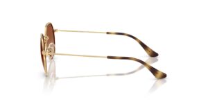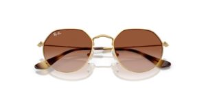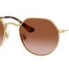 This round Ray-Ban sunglass comes in a arista gold frame with brown gradient lenses.