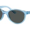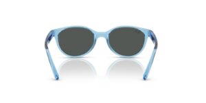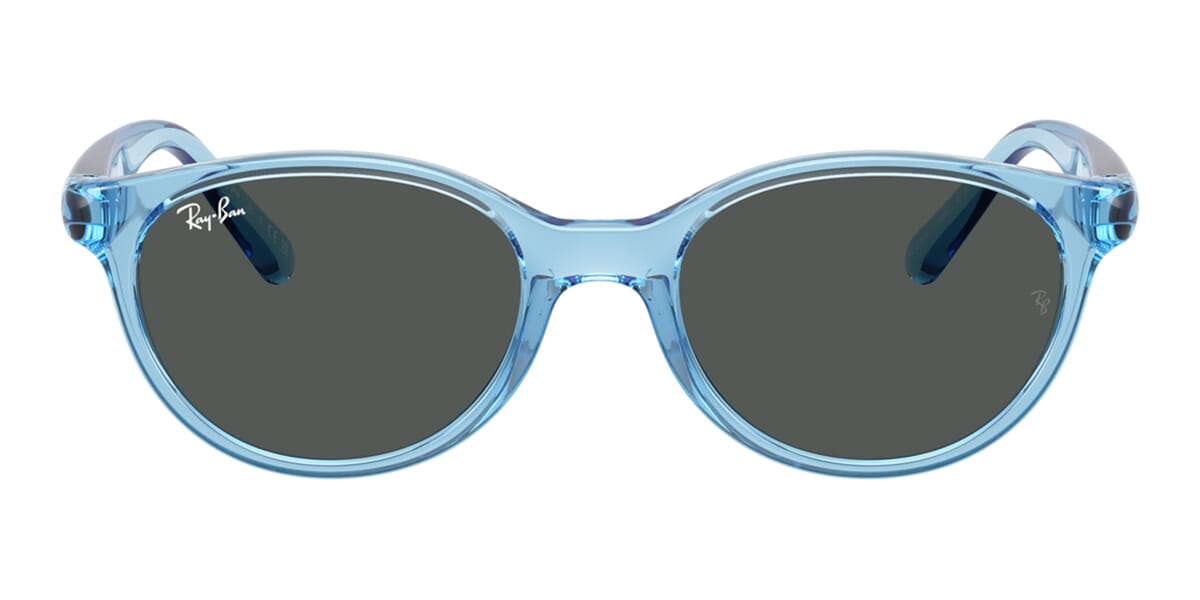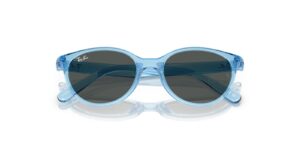 This round Ray-Ban sunglass comes in a transparent blue frame with dark grey lenses.