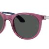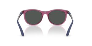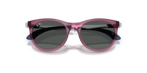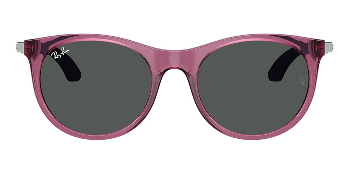 This round Ray-Ban sunglass comes in a violet crystal frame with dark grey lenses.