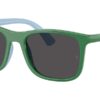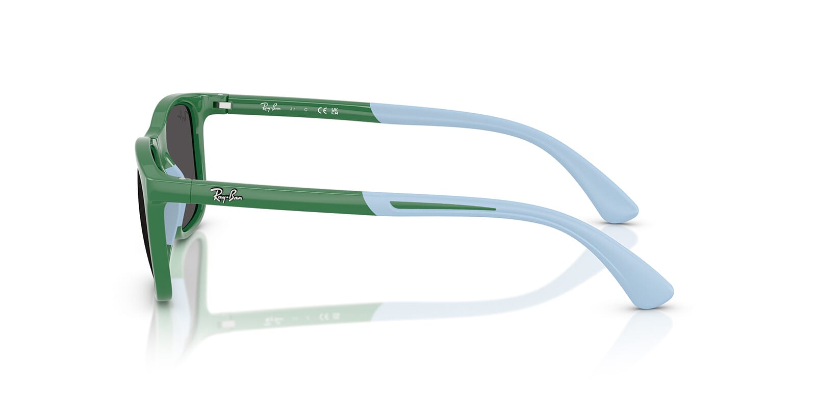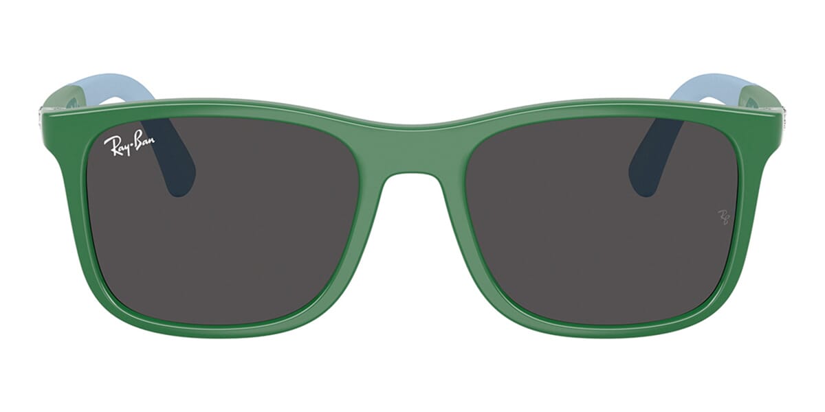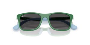 This square Ray-Ban sunglass comes in a green on light blue rubber frame with dark grey lenses.