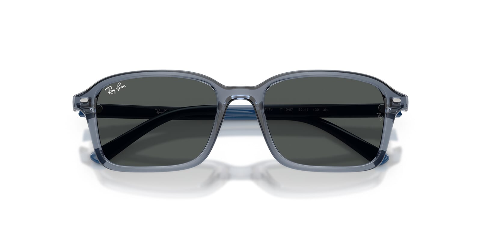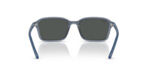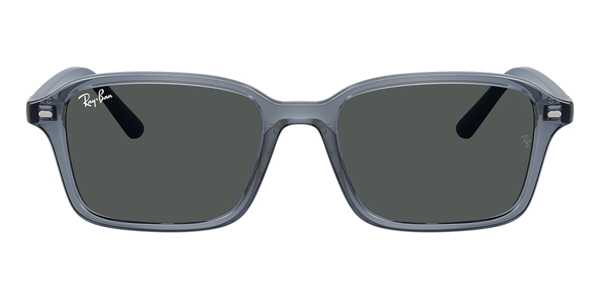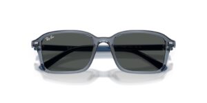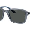 This square Ray-Ban sunglass comes in a blue crystal frame with dark grey lenses.
