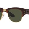 This square Ray-Ban sunglass comes in a tortoise on arista frame with green lenses.