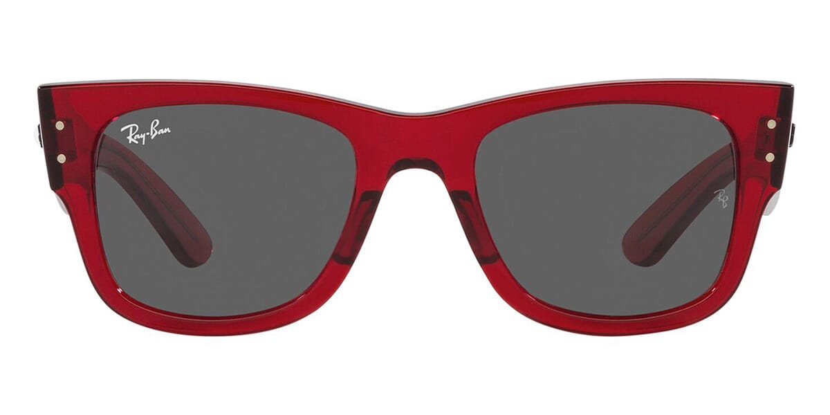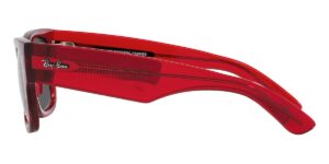 This square Ray-Ban sunglass comes in a red crystal frame with dark grey lenses.