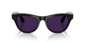 This cat eye Ray-Ban sunglass comes in a shiny black frame with clear to graphite amethyst purple photochromic transitions lenses.
