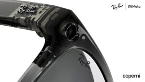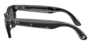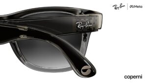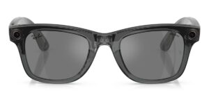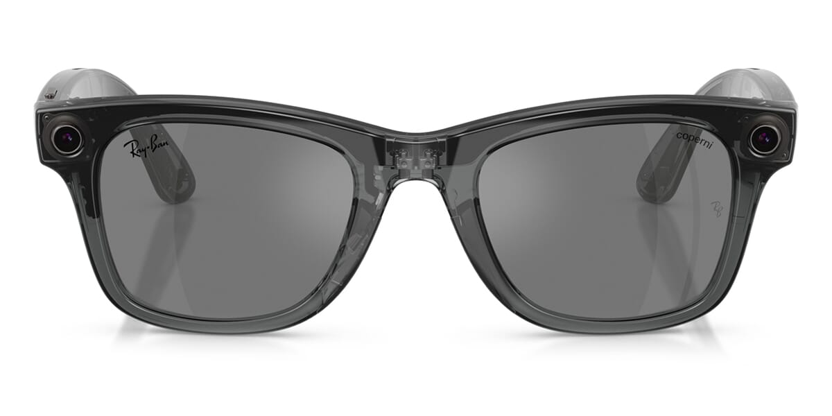 This wayfarer Ray-Ban Meta x Coperni smart glasses comes in a transparent black frame with grey mirror lenses and is Limited Edition.