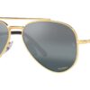 This aviator Ray-Ban sunglass comes in a legend gold frame with grey with silver and blue gradient mirror polarised lenses.