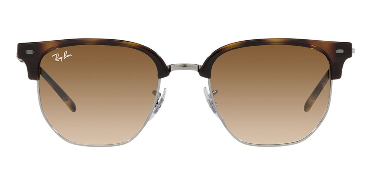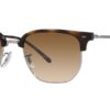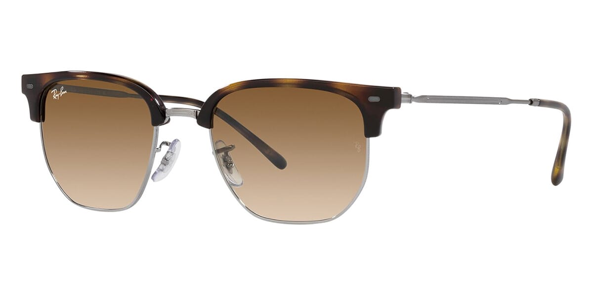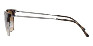 This rectangular Ray-Ban sunglass comes in a havana on gunmetal frame with brown to clear gradient lenses.