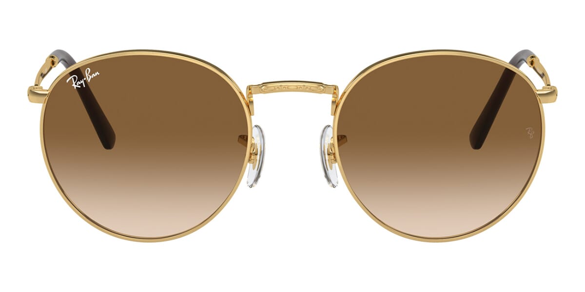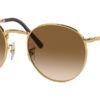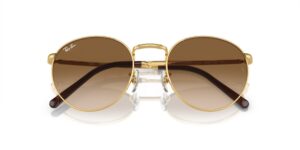 This round Ray-Ban sunglass comes in a gold frame with brown gradient lenses.