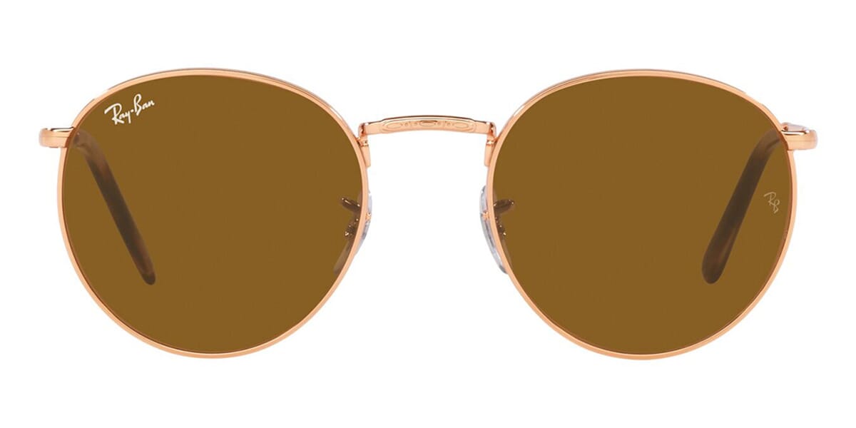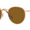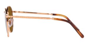 This round Ray-Ban sunglass comes in a rose gold frame with brown lenses.