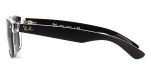 This wayfarer Ray-Ban sunglass comes in a black on transparent frame with g15 green lenses.