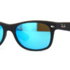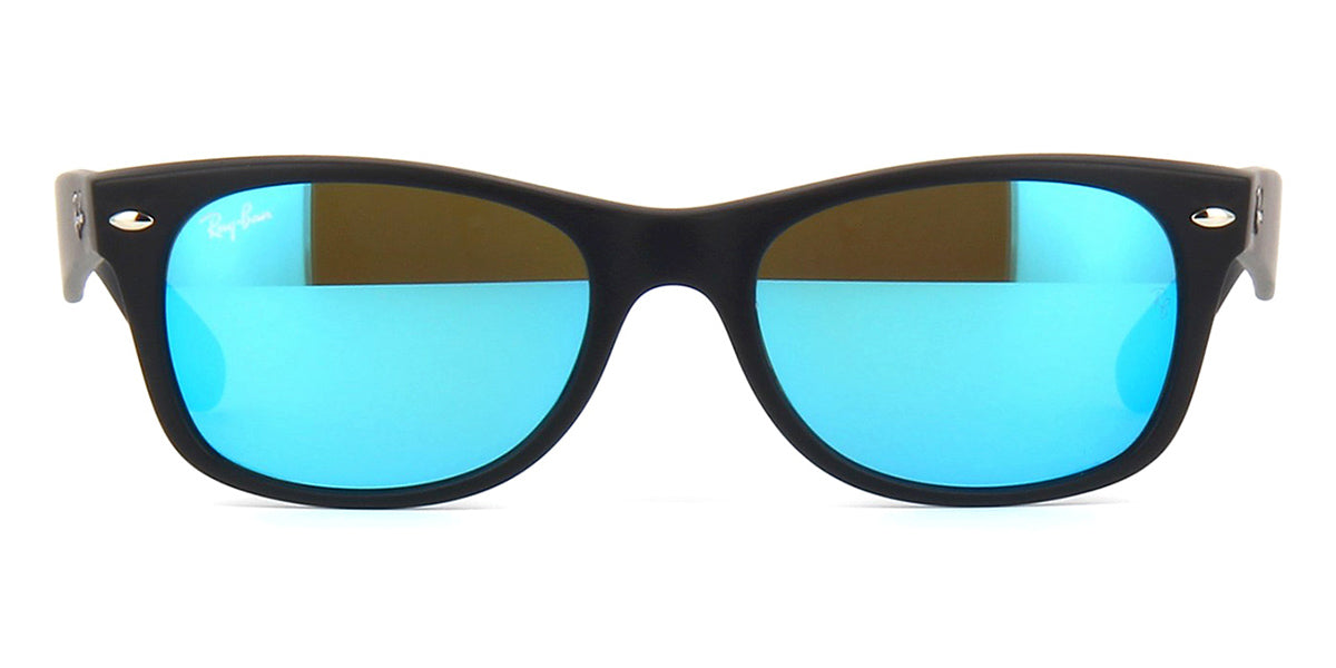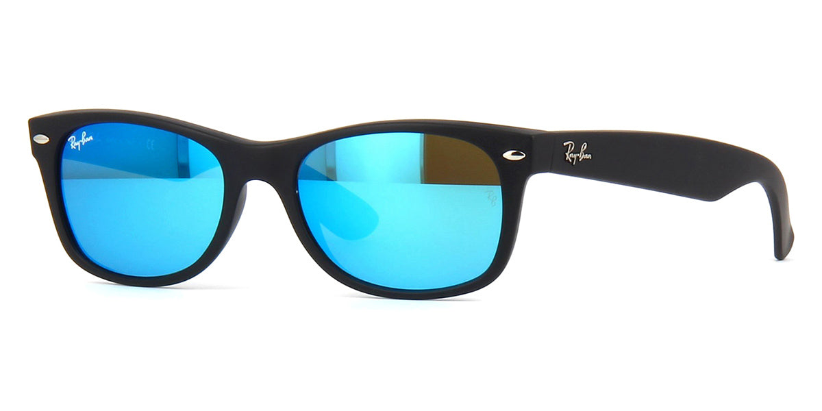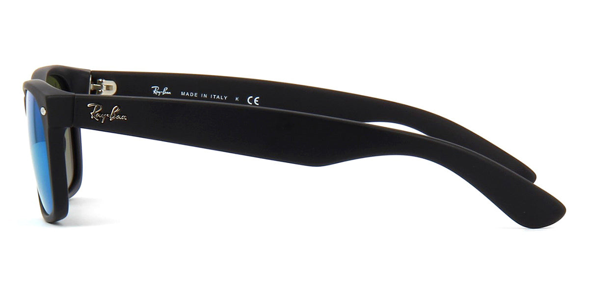 This wayfarer Ray-Ban sunglass comes in a black rubber frame with grey with blue flash mirror lenses.