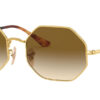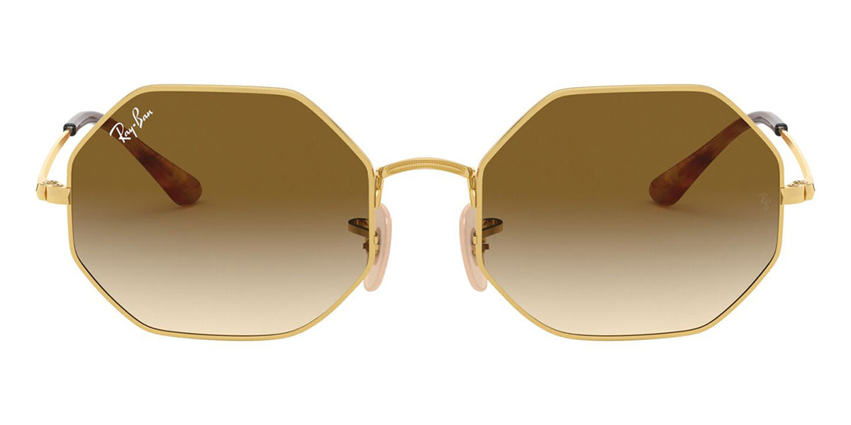 This rectangular Ray-Ban sunglass comes in a gold frame with brown to clear gradient lenses.