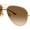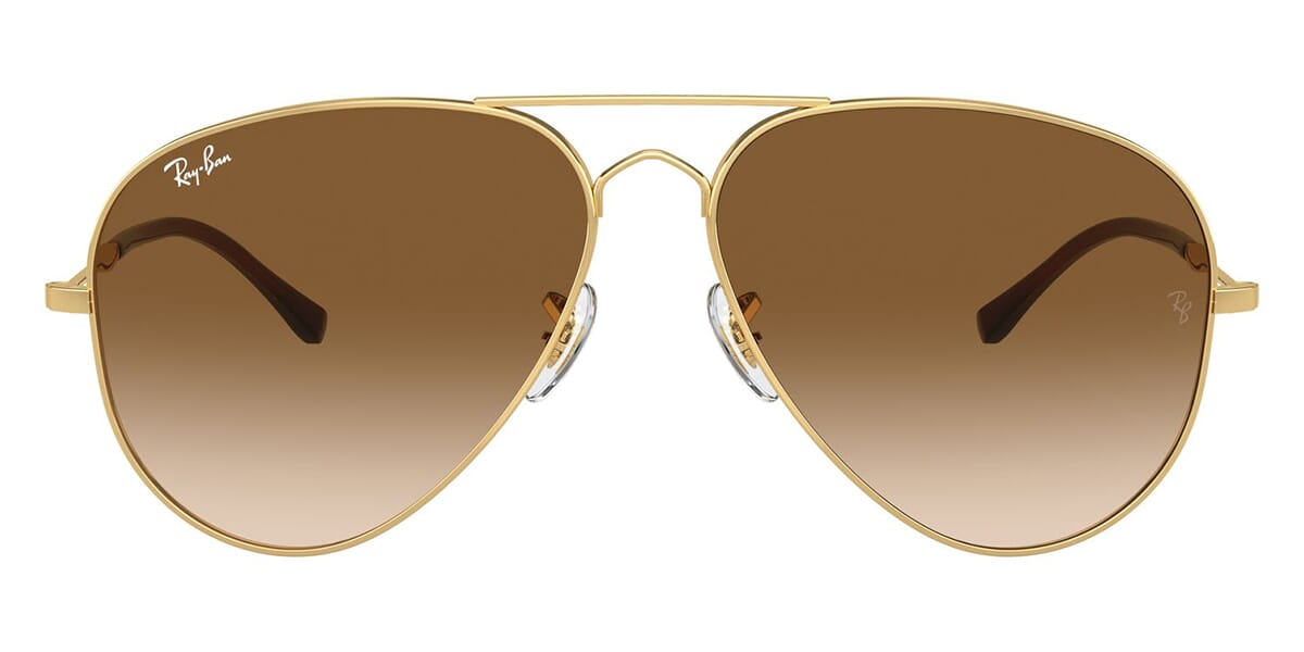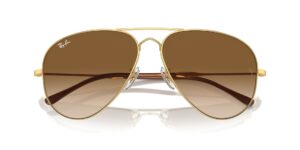 This aviator Ray-Ban sunglass comes in a gold frame with brown to clear gradient lenses.