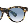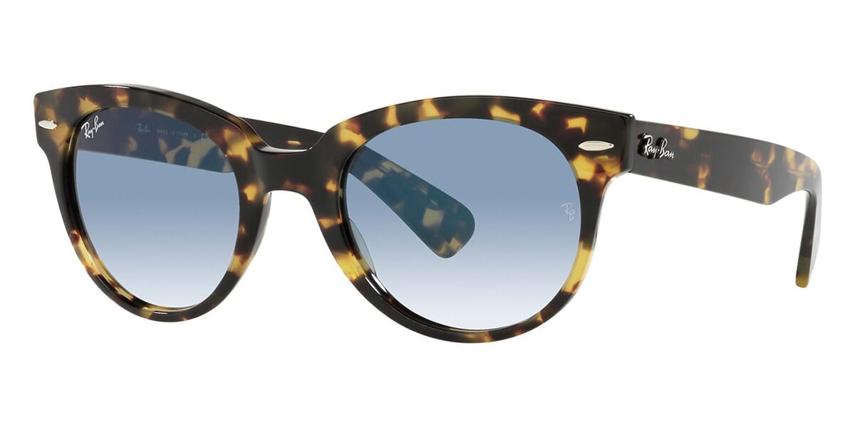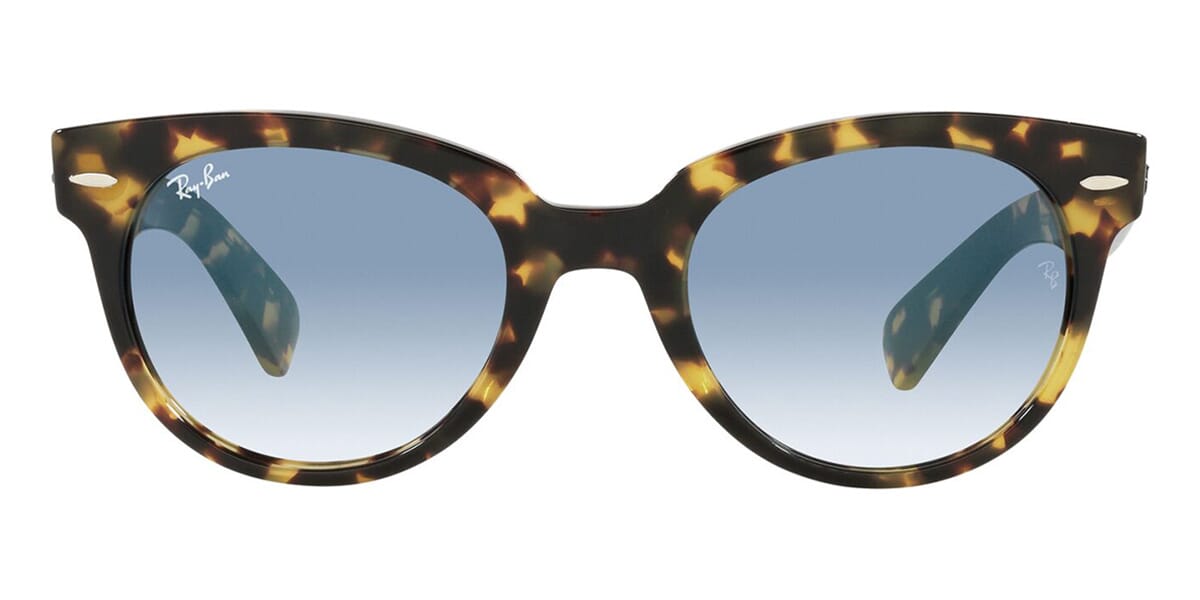This square Ray-Ban sunglass comes in a yellow havana frame with blue to clear gradient lenses.