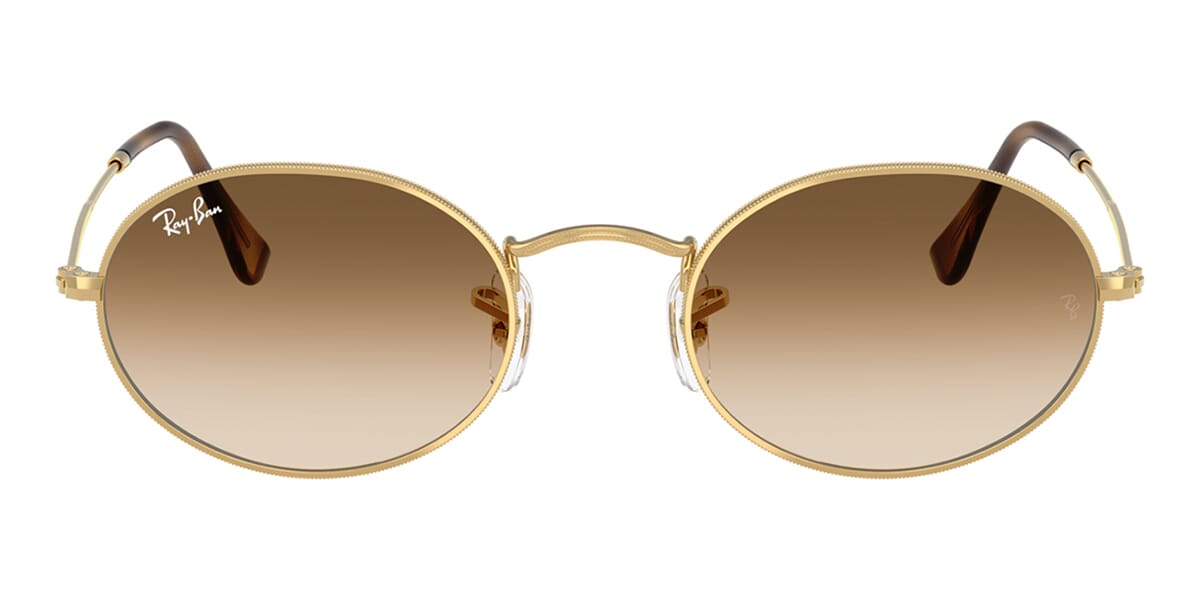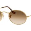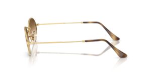 This round Ray-Ban sunglass comes in a arista gold frame with brown to clear gradient lenses.