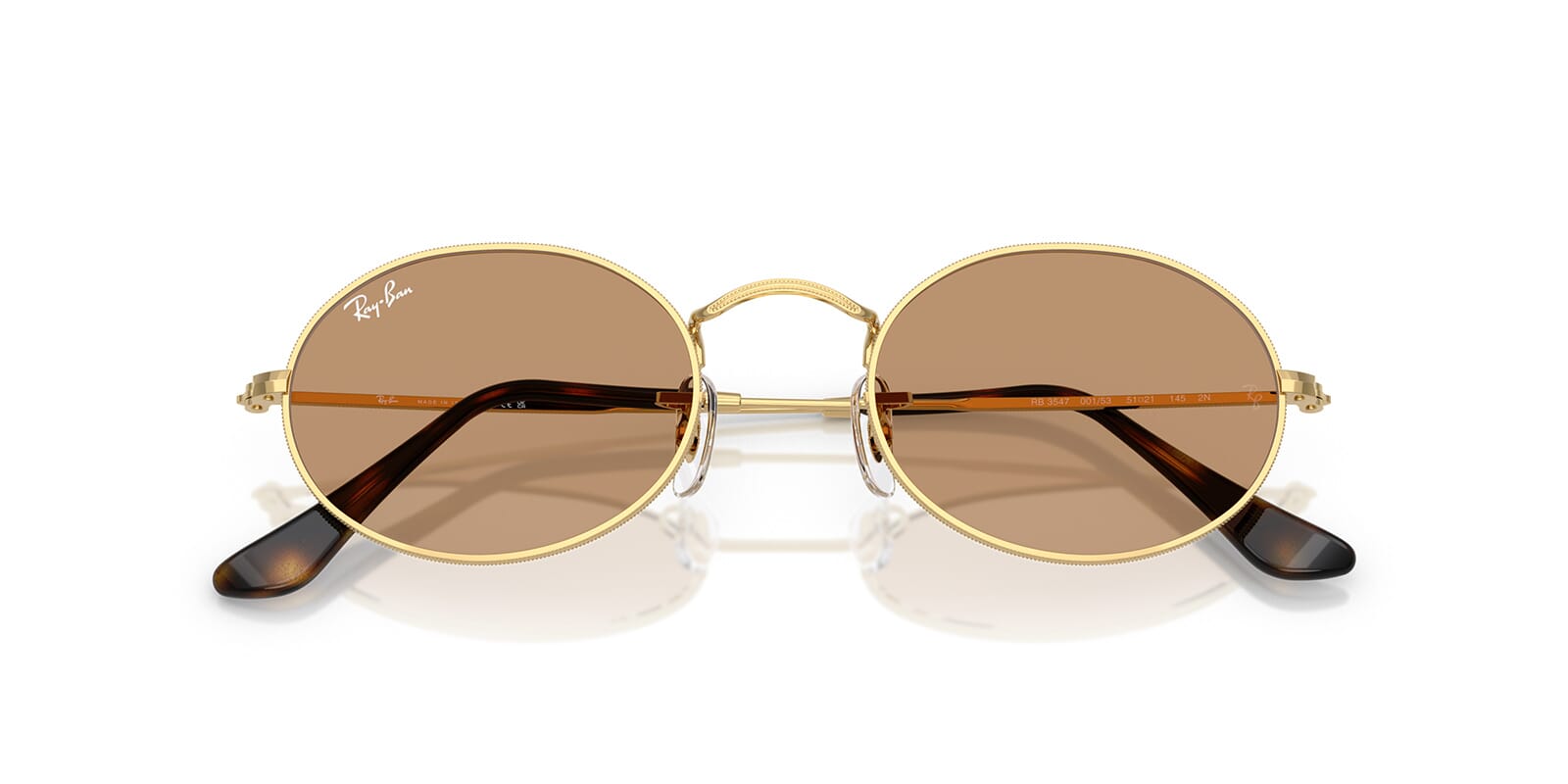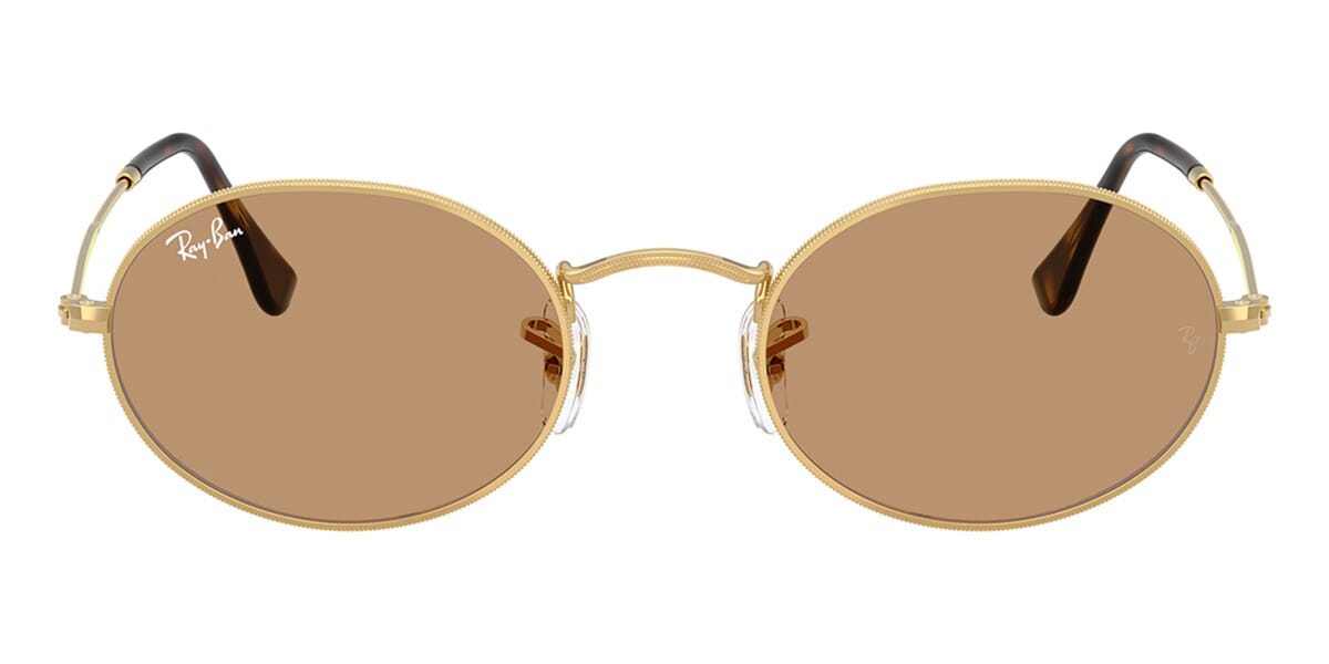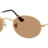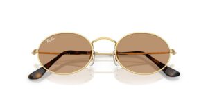 This round Ray-Ban sunglass comes in a arista gold frame with brown lenses.