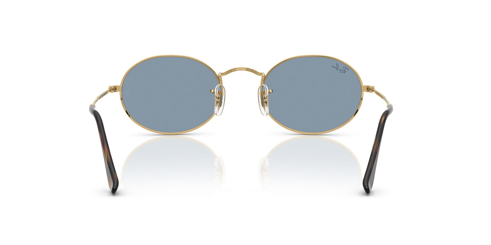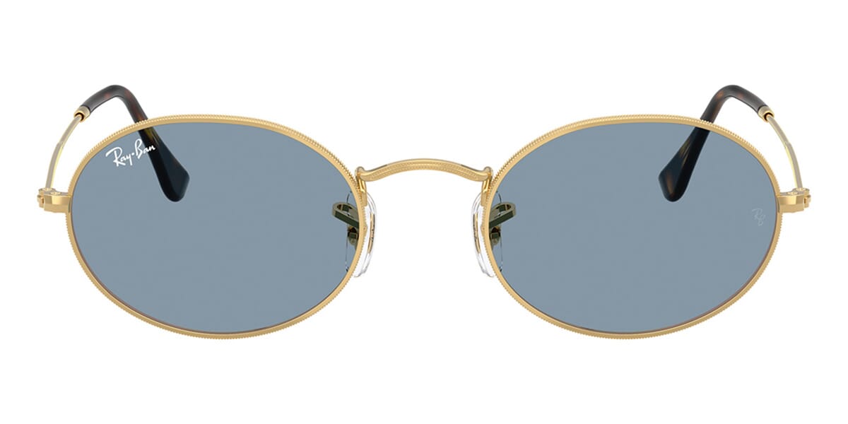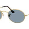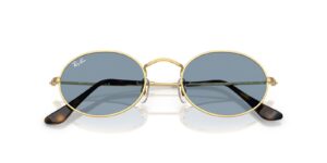 This round Ray-Ban sunglass comes in a arista gold frame with blue lenses.