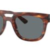 This square Ray-Ban sunglass comes in a striped havana frame with dark blue lenses.