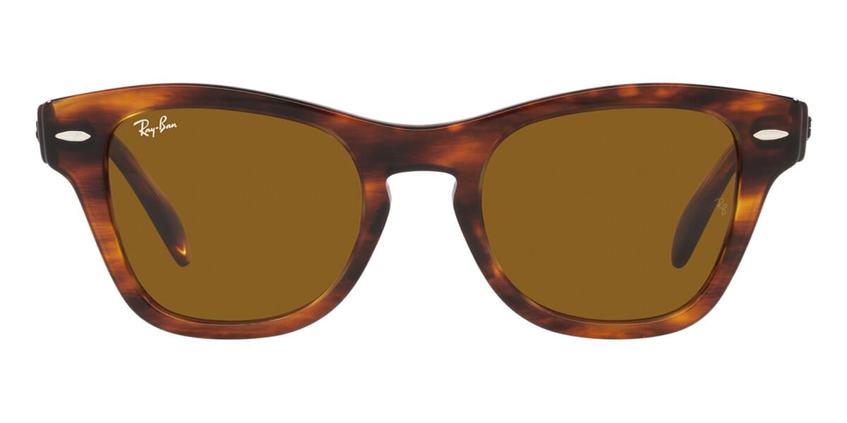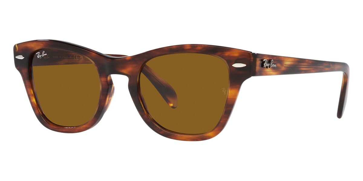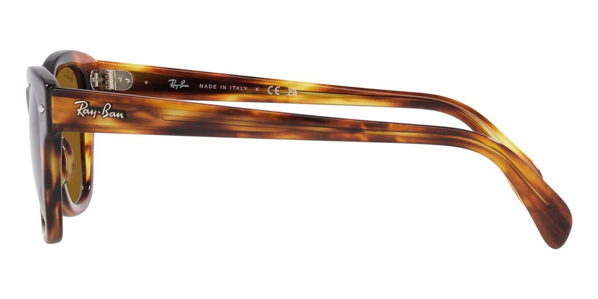 This square Ray-Ban sunglass comes in a striped havana frame with brown lenses.