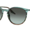 This round Ray-Ban sunglass comes in a striped blue and gradient green frame with blue vintage to grey gradient lenses.