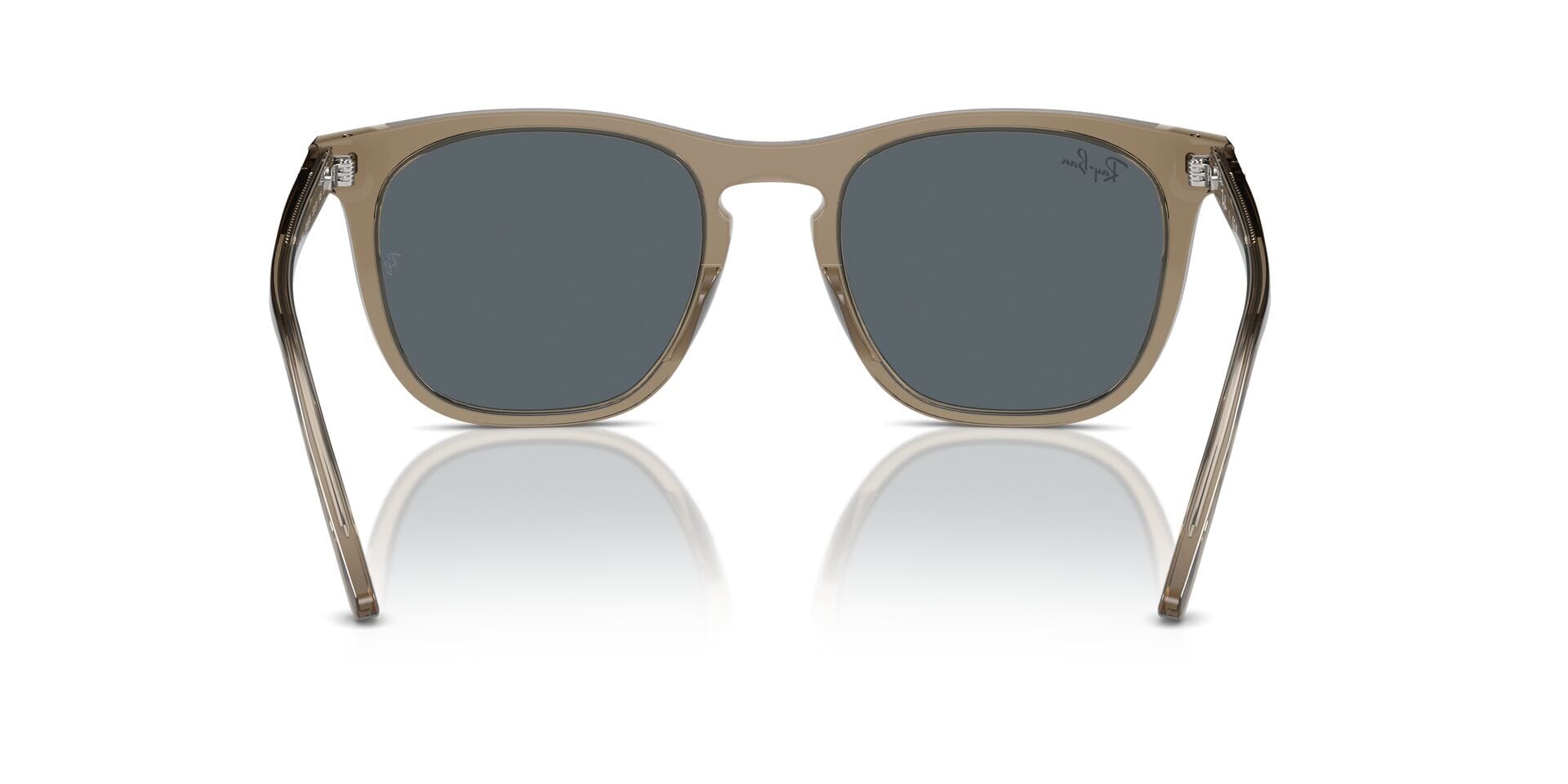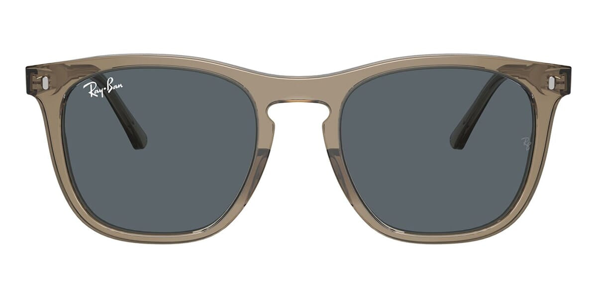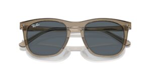 This square Ray-Ban sunglass comes in a brown crystal frame with blue lenses.
