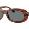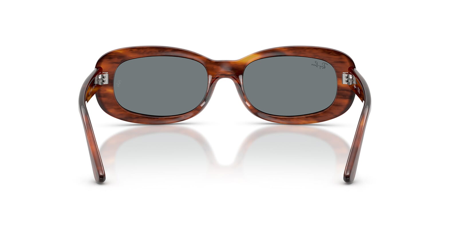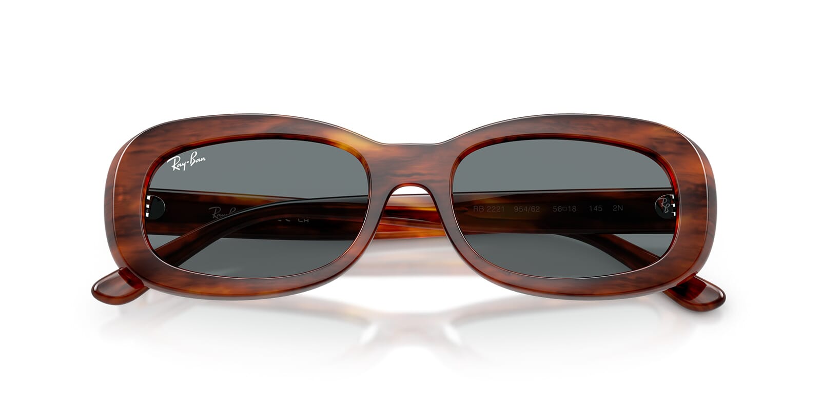 This round Ray-Ban sunglass comes in a striped havana frame with blue lenses.