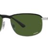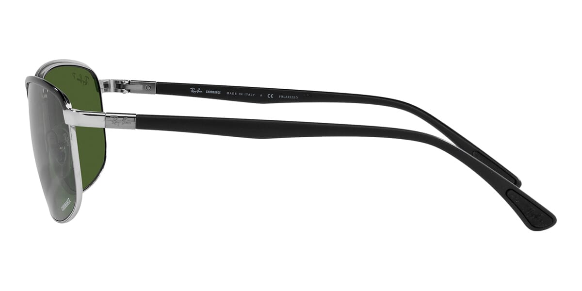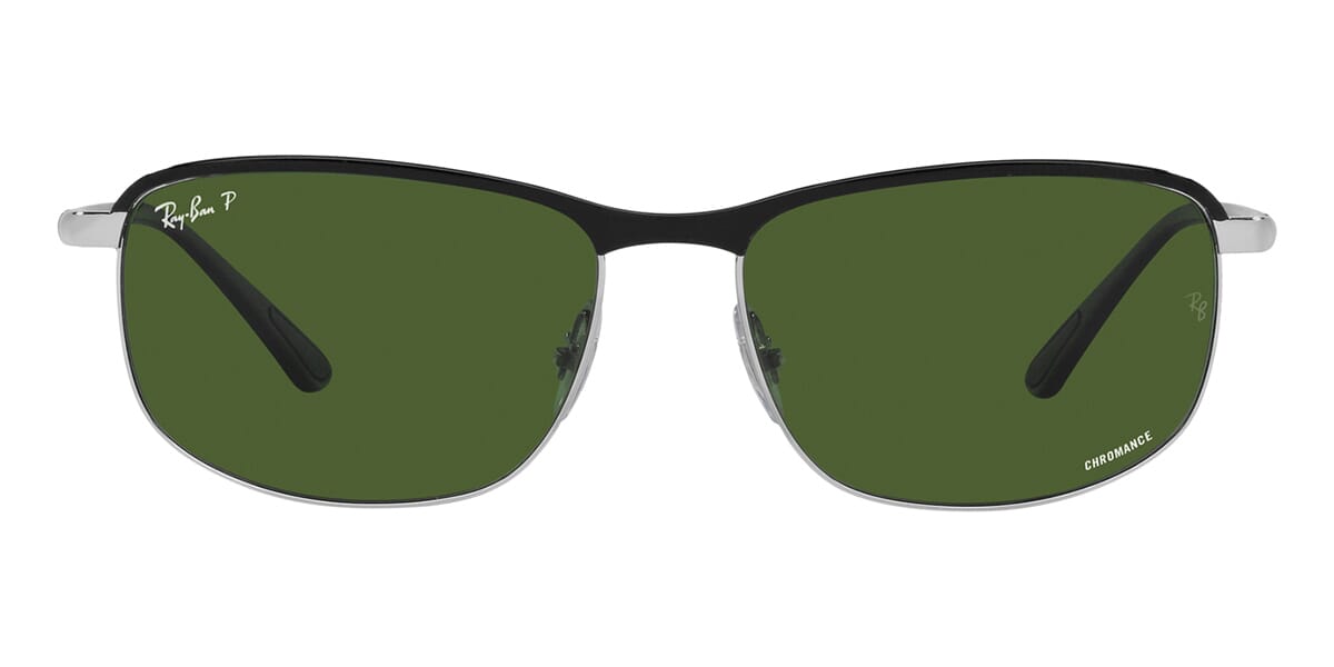 This rectangular Ray-Ban sunglass comes in a black on silver frame with dark green polarised lenses.