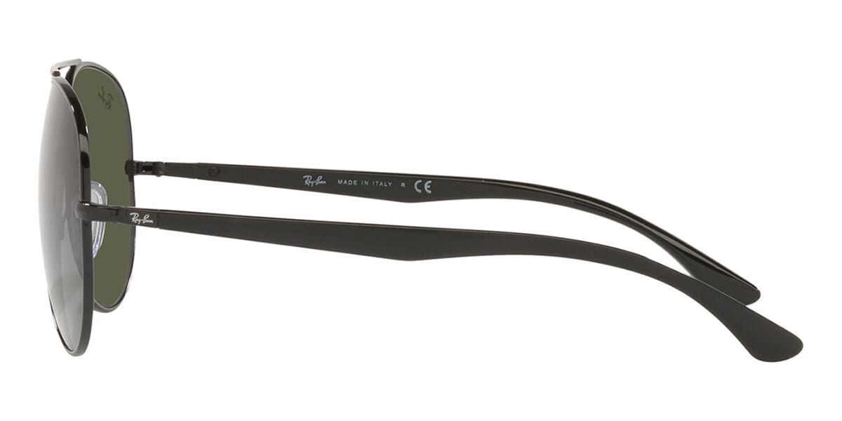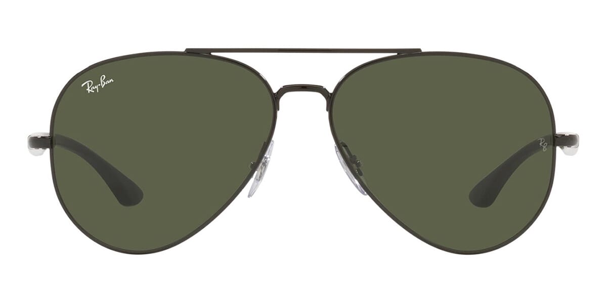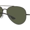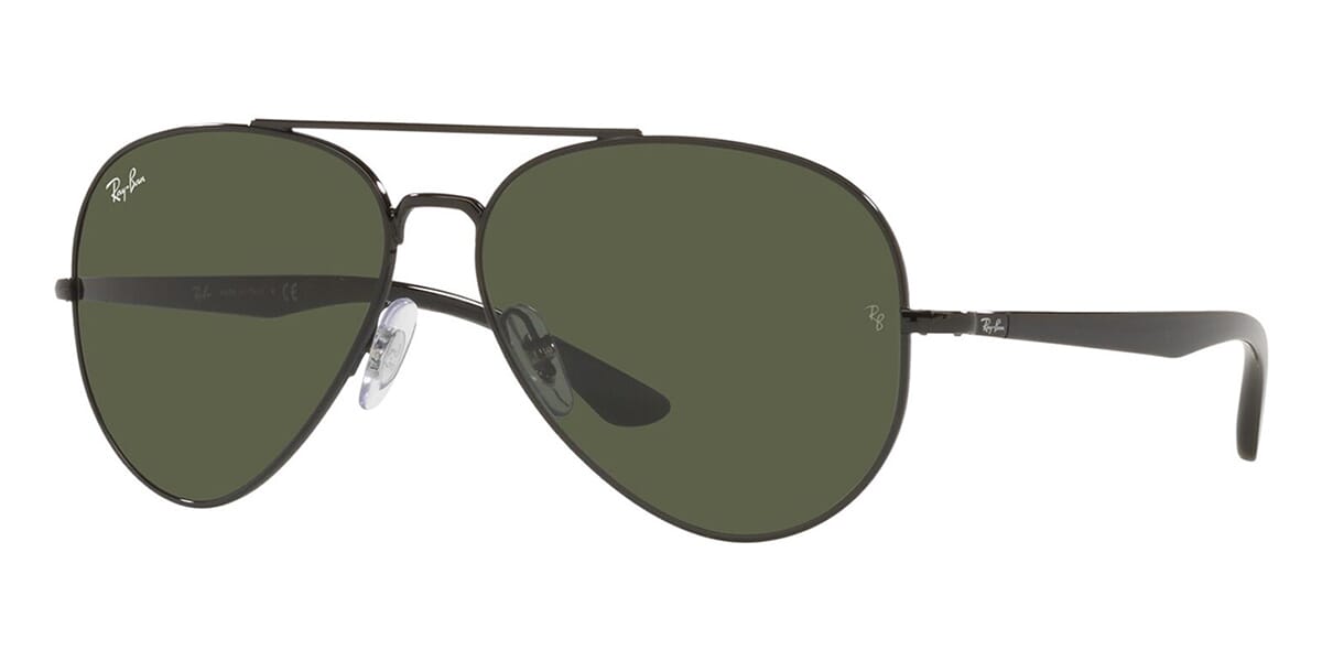 This aviator Ray-Ban sunglass comes in a black frame with green lenses.
