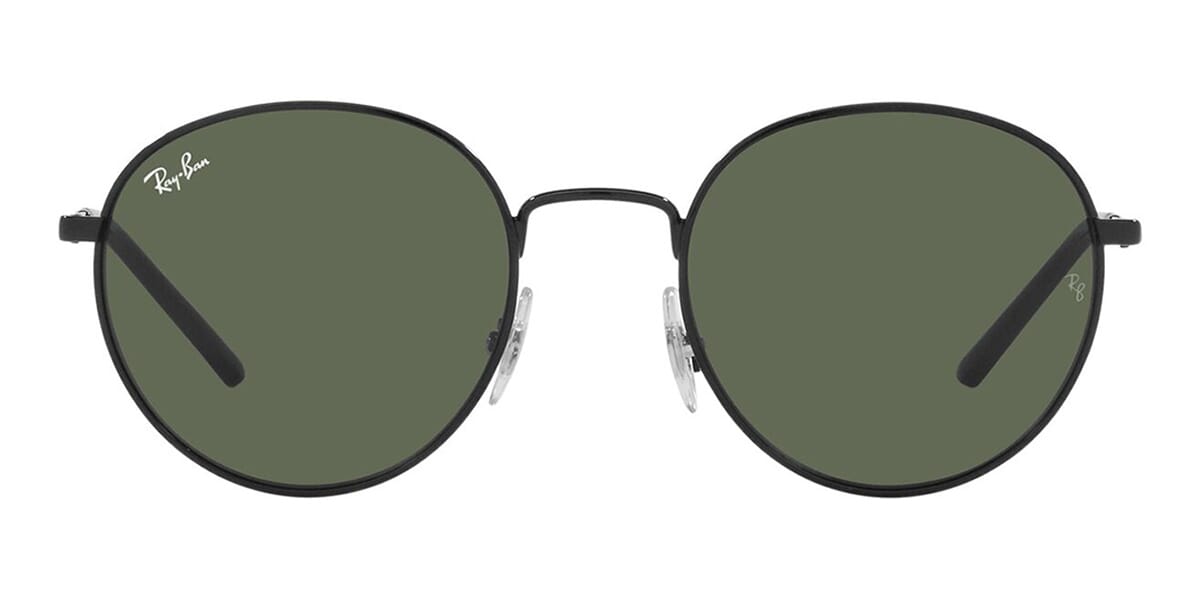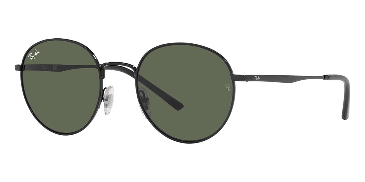 This round Ray-Ban sunglass comes in a black frame with dark green lenses.