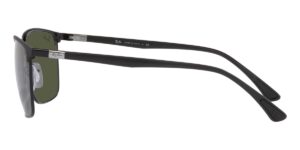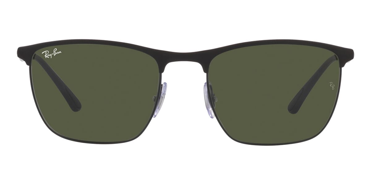 This square Ray-Ban sunglass comes in a matte black on black frame with green lenses.
