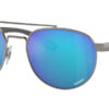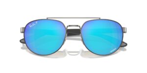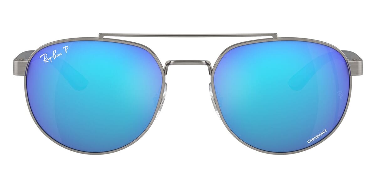 This round Ray-Ban sunglass comes in a gunmetal frame with green with blue mirror polarised lenses.