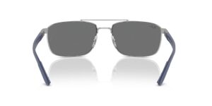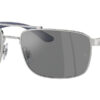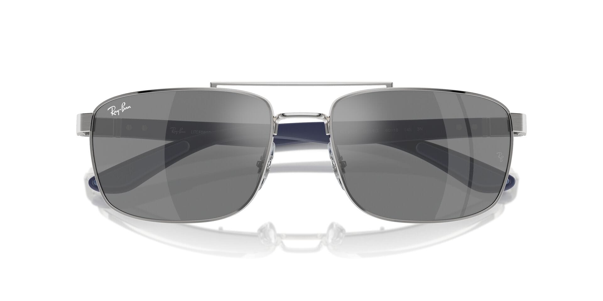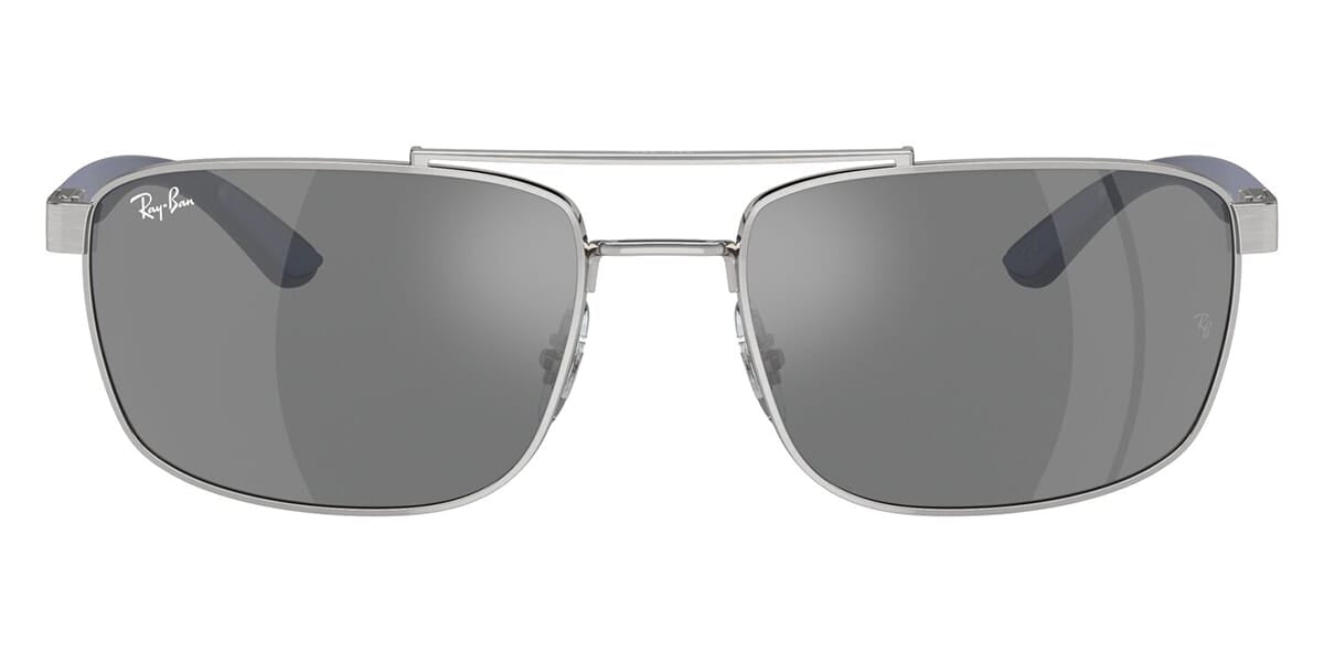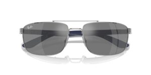 This rectangular Ray-Ban sunglass comes in a silver frame with grey with silver mirror lenses.